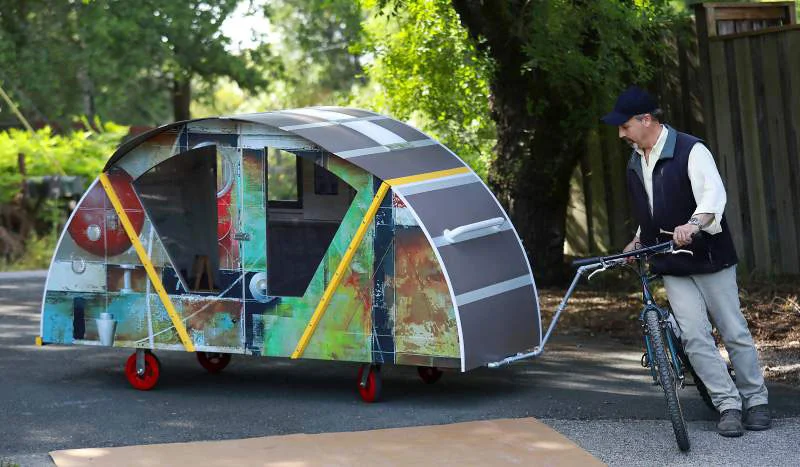 Sebastopol architect Ken Berman designed a mobile shelter he calls "The Turtle" that can be towed by a bike. The shelter includes LED lighting, storage and an iPad mounting system. (John Burgess/The Press Democrat)